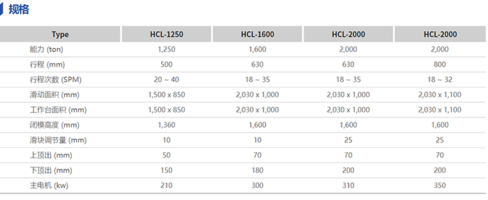 HCL系列适合热锻及温锻成型作业,且比曲柄压力机强度更高,在下死点的成型能力也更高。同时,加压时滑块易于维持平行度,压力机在动态作业时也可维持静态时的精度。